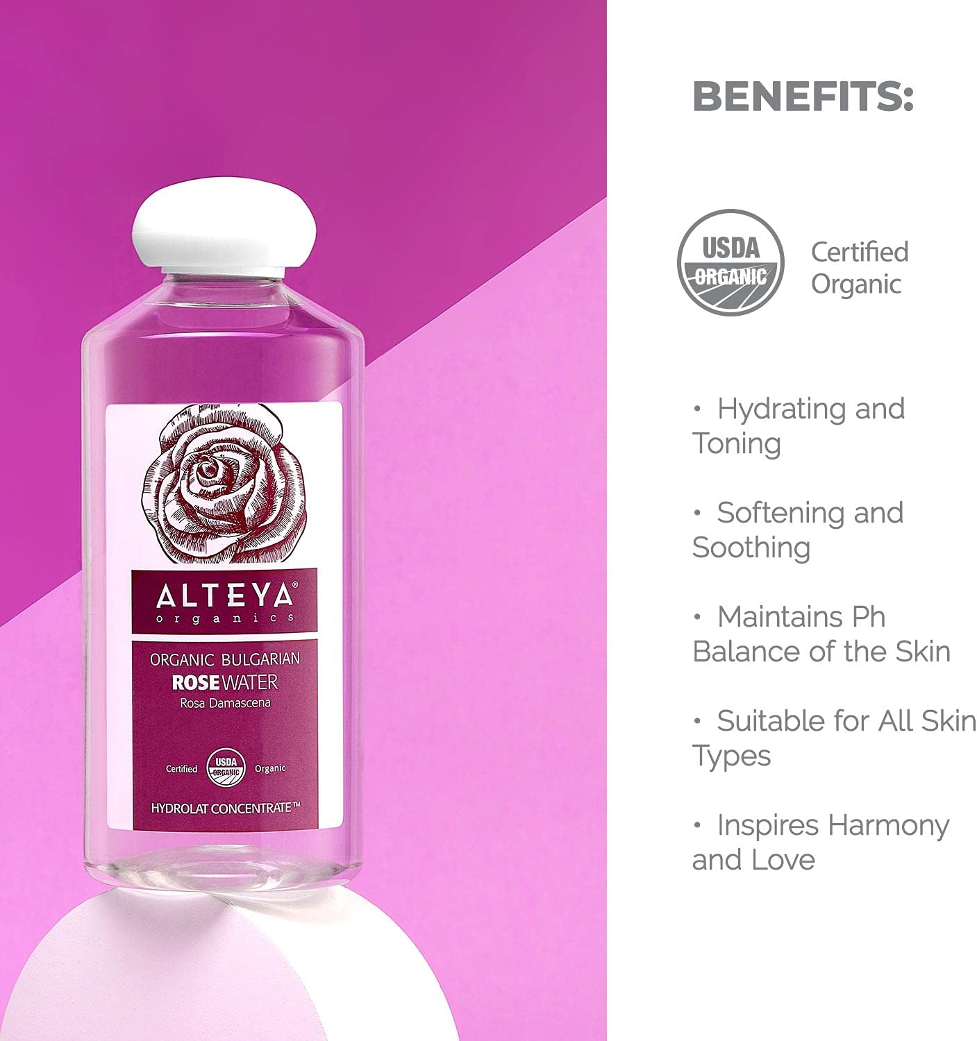 - PRIMARY STEAM-DISTILLED BY ALTEYA: Distilled directly from fresh Rosa Damascena Bulgaria petals, and via Alteya’s proprietary methodology that combines traditions with science to capture the most complete range of aromatic plants’ benefits, with a rich composition of essential oil micro-elements and full concentration of hydrophilic components. As a result, our organic rose water has multiple skin benefits and applications in beauty and wellbeing.