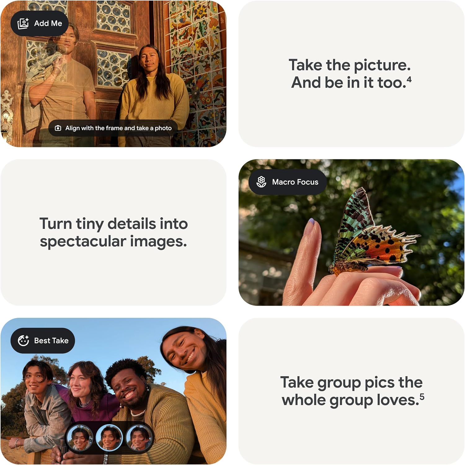 • Take amazing photos and videos with the Pixel Camera, and make them better than you can imagine with Google AI; get great group photos with Add Me and Best Take[4,5]; and use Macro Focus for spectacular images of tiny details like raindrops and flowers