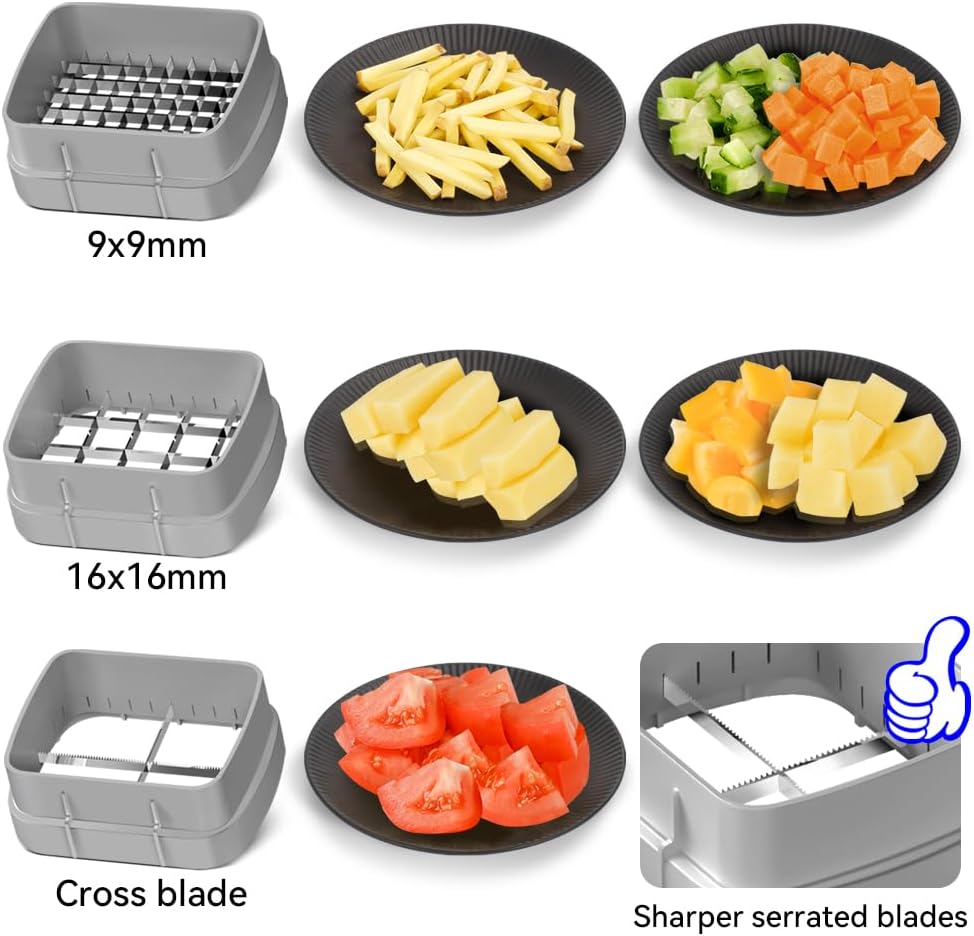 - Three Interchangeable Chopper Blades: Includes a 9mm blade for fine dicing onions or slicing potatoes into fries, a 16mm blade for thick-cut fries or stew chunks, and a cross blade for quartering tomatoes, potatoes, lemons, or oranges—handles all dicing tasks in seconds.