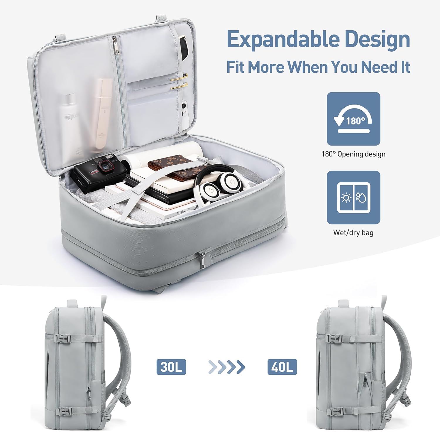 - Expandable Large Capacity Travel Backpack: Size: 18.89 x 11.8 x 7.87 inches and features an innovative expansion zipper that unlocks 40L of spacious capacity – perfect for accommodating extra travel essentials or weekend getaway gear. The ergonomically designed top handle is generously padded with 1.5cm cushioning, ensuring comfortable carrying even when fully loaded, while maintaining a streamlined silhouette that fits effortlessly under airplane seats.