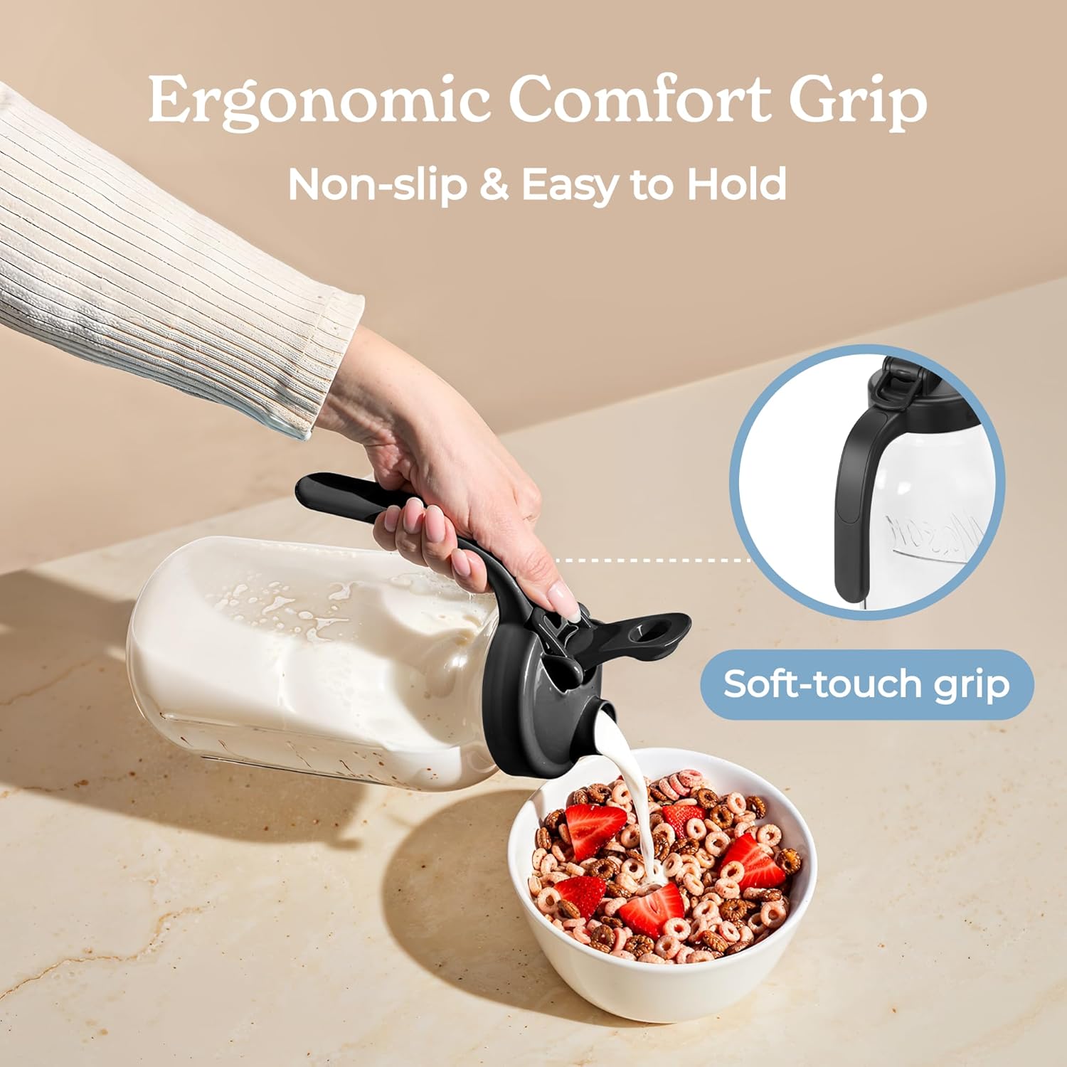 - Functional design: The non-slip handle on this 2-quart pitcher with lid ensures steady pouring. Hanging a ring on these large mason jars adds convenience for easy carrying and storage