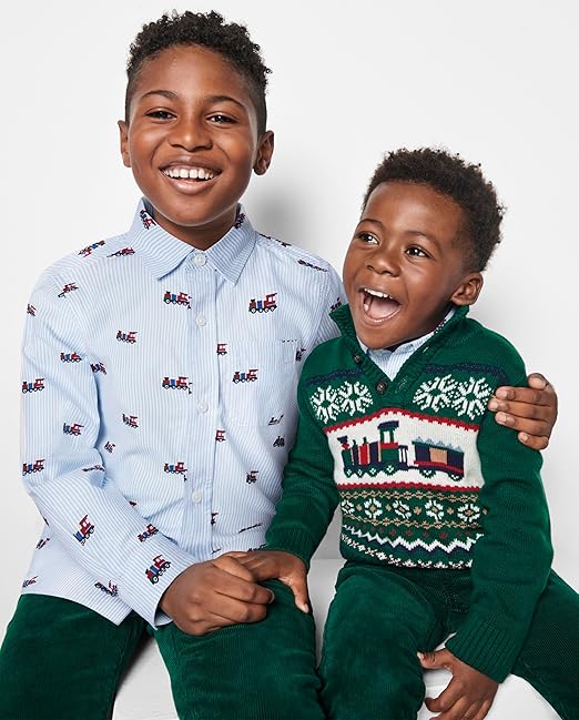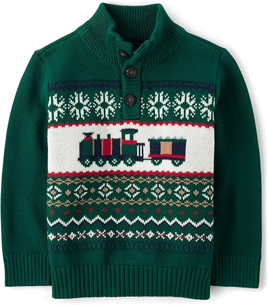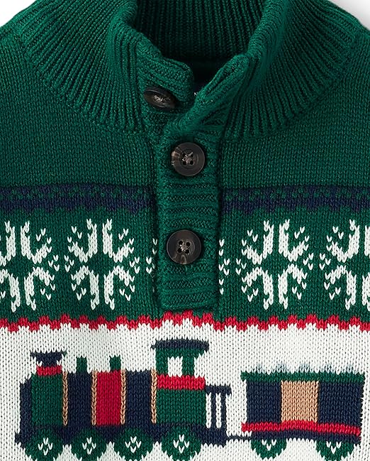 - HALF BUTTON SWEATER — He’s cozy and cute in a sweater with a half-button placket that will keep him warm.